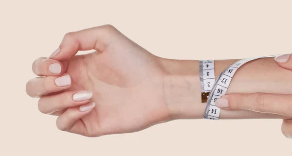 La paume de la main ouverte et tournée vers le haut, enroulez le ruban à mesurer autour de votre poignet, juste au-dessus de l'os du poignet. Notez la mesure de la taille de votre poignet.