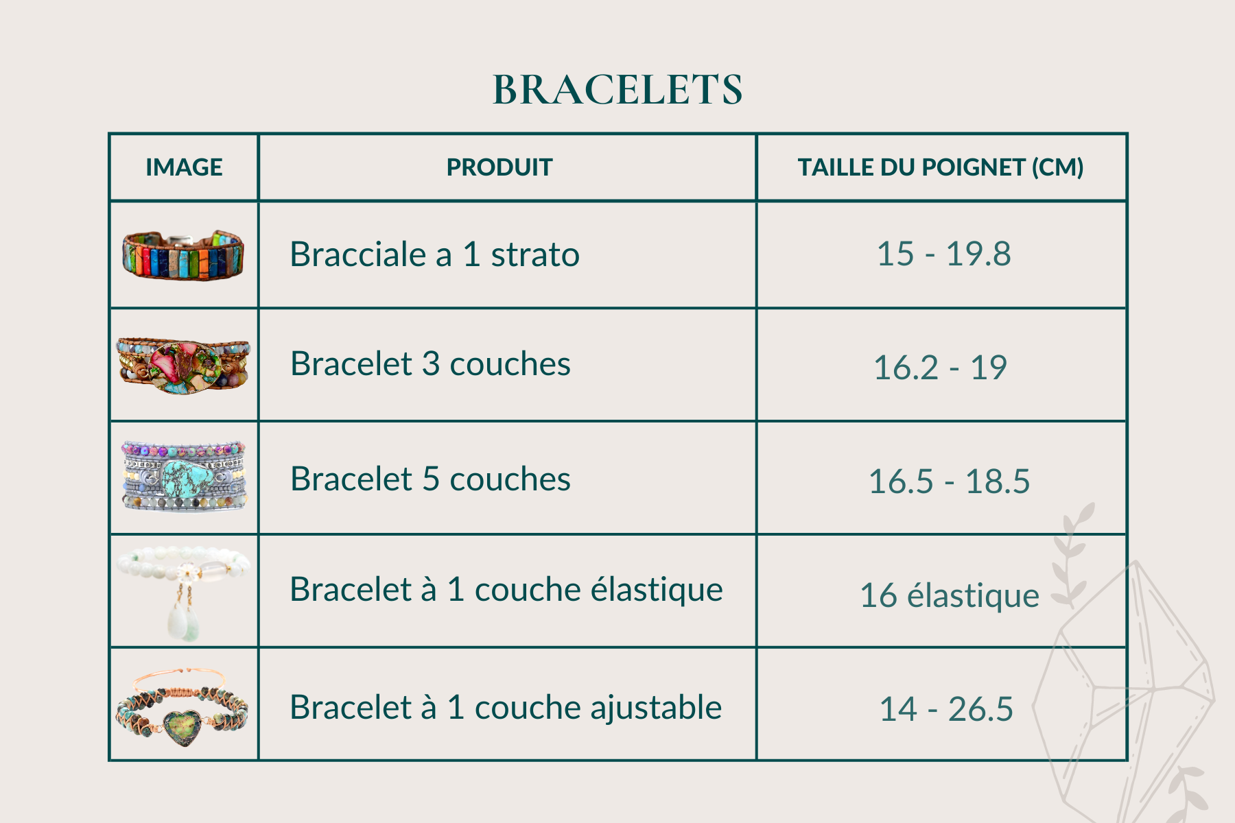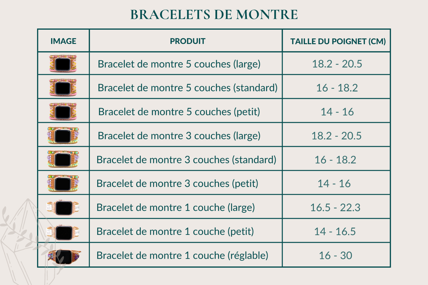 En utilisant la mesure du poignet que vous venez de trouver, trouvez le tableau de votre type de bracelet préféré pour voir quelle taille de bracelet correspond à votre taille de poignet.